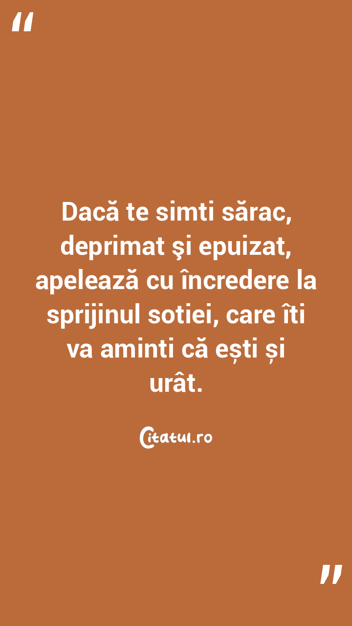 Dacă te simți sărac, deprimat şi epuizat, apelează cu încredere la sprijinul soției, care îți va aminti că ești și urât.