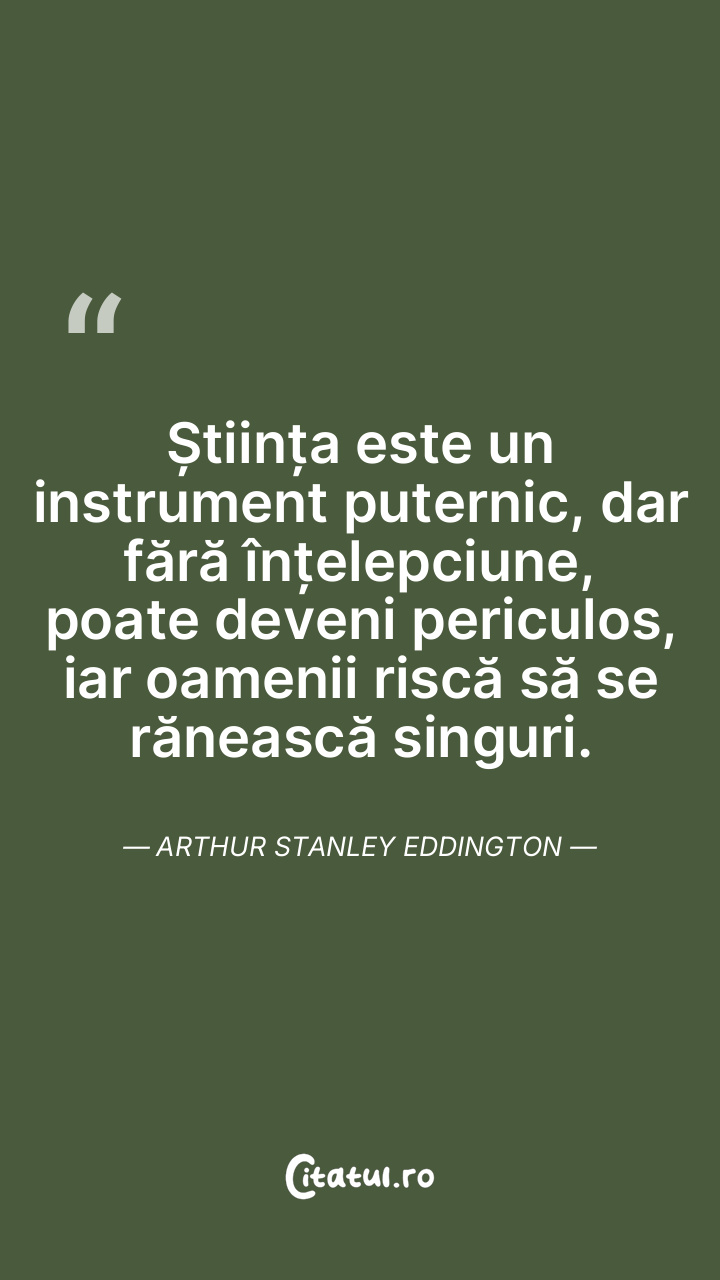 Știința este un instrument puternic, dar fără înțelepciune, poate deveni periculos, iar oamenii riscă să se rănească singuri. Arthur Stanley Eddington