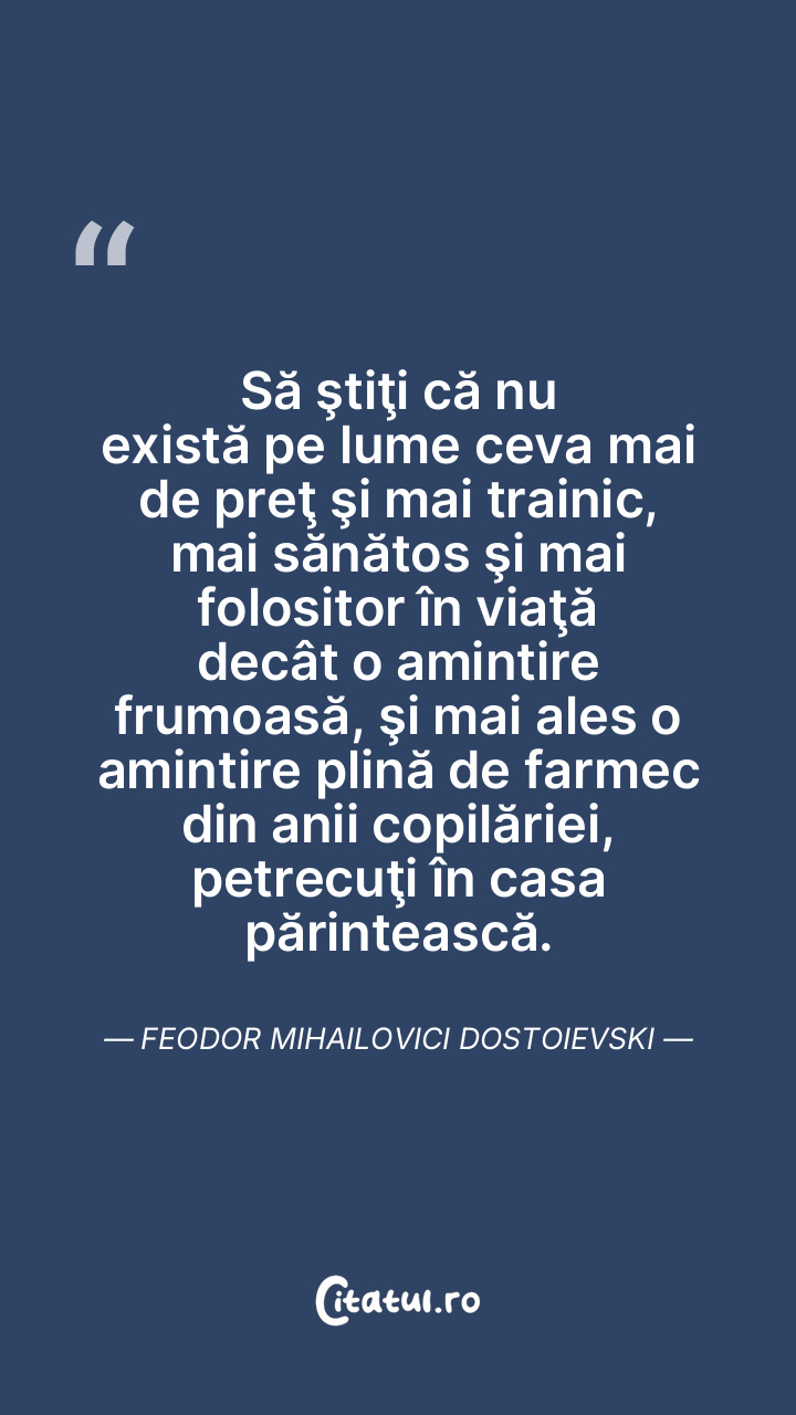 Să ştiţi că nu există pe lume ceva mai de preţ şi mai trainic, mai sănătos şi mai folositor în viaţă decât o amintire frumoasă, şi mai ales o amintire plină de farmec din anii copilăriei, petrecuţi în casa părintească. Feodor Mihailovici Dostoievski