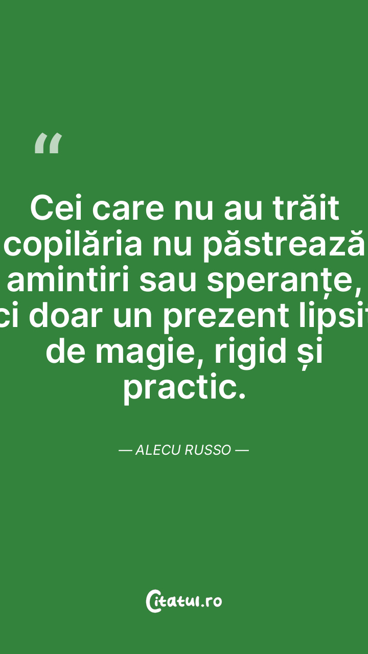 Cei care nu au trăit copilăria nu păstrează amintiri sau speranțe, ci doar un prezent lipsit de magie, rigid și practic. Alecu Russo