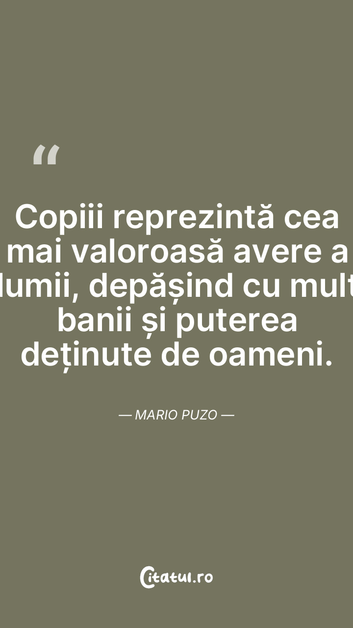 Copiii reprezintă cea mai valoroasă avere a lumii, depășind cu mult banii și puterea deținute de oameni. Mario Puzo