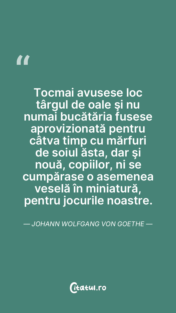 Tocmai avusese loc târgul de oale şi nu numai bucătăria fusese aprovizionată pentru câtva timp cu mărfuri de soiul ăsta, dar şi nouă, copiilor, ni se cumpărase o asemenea veselă în miniatură, pentru jocurile noastre. Johann Wolfgang von Goethe