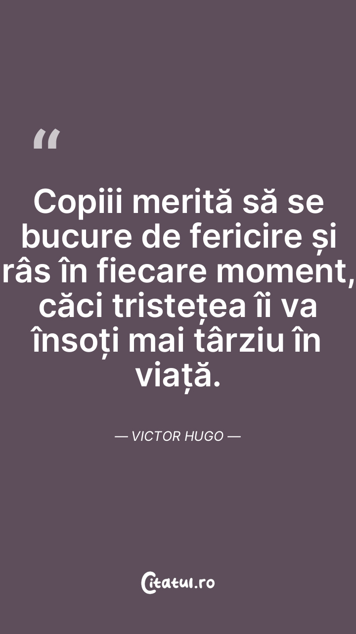 Copiii merită să se bucure de fericire și râs în fiecare moment, căci tristețea îi va însoți mai târziu în viață. Victor Hugo