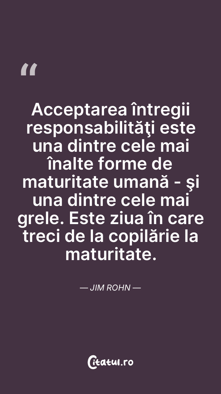 Acceptarea întregii responsabilităţi este una dintre cele mai înalte forme de maturitate umană - şi una dintre cele mai grele. Este ziua în care treci de la copilărie la maturitate. Jim Rohn