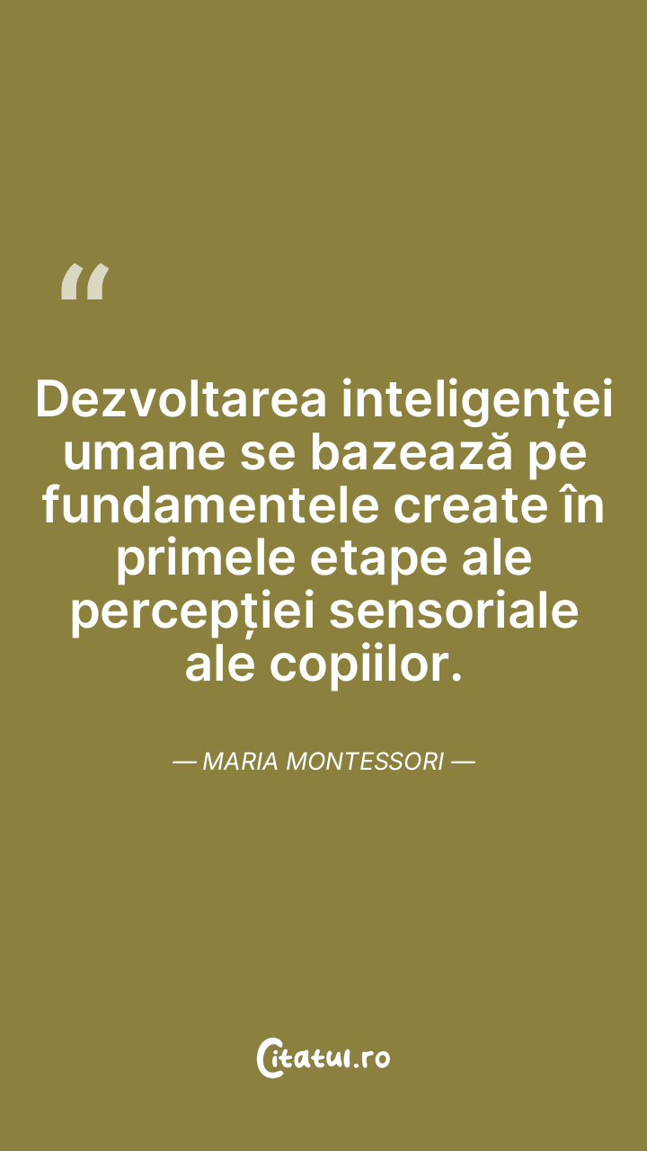 Dezvoltarea inteligenței umane se bazează pe fundamentele create în primele etape ale percepției sensoriale ale copiilor. Maria Montessori