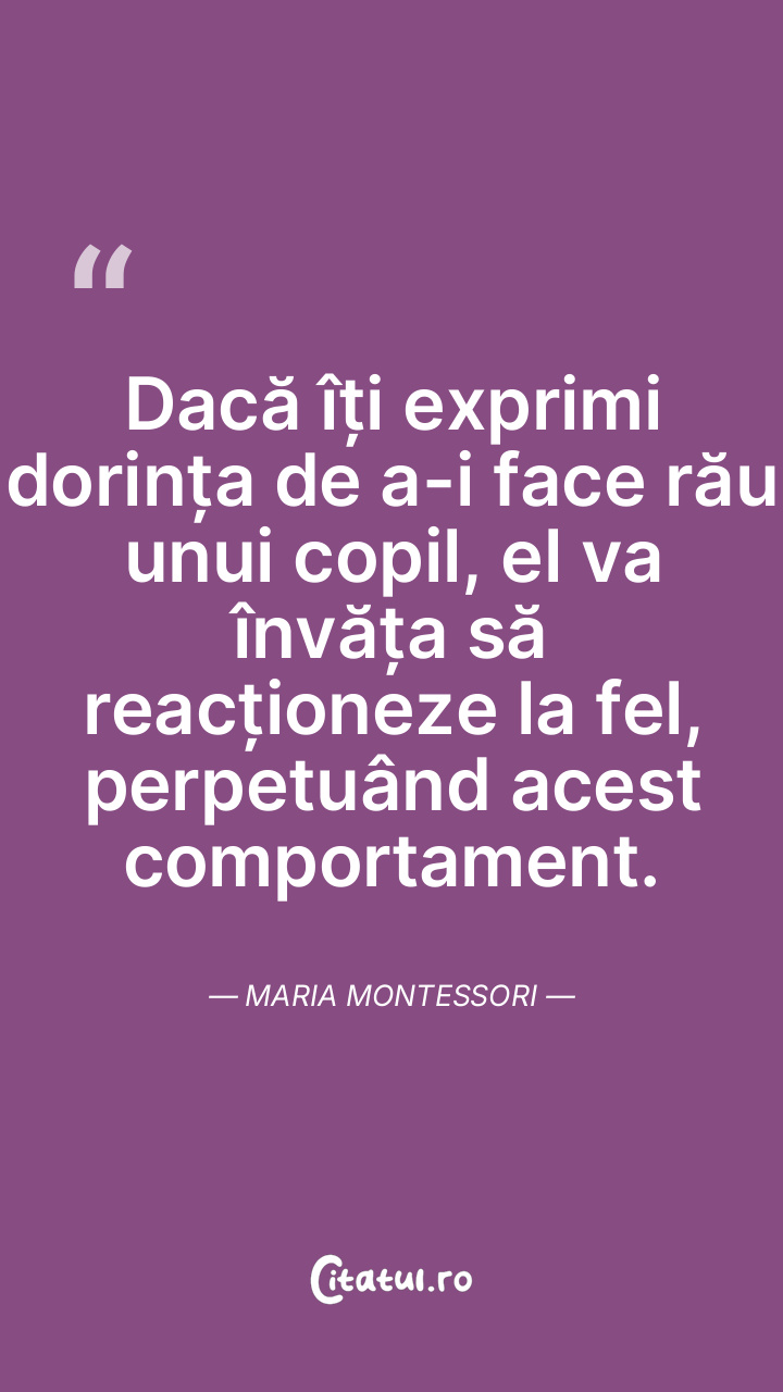Dacă îți exprimi dorința de a-i face rău unui copil, el va învăța să reacționeze la fel, perpetuând acest comportament. Maria Montessori