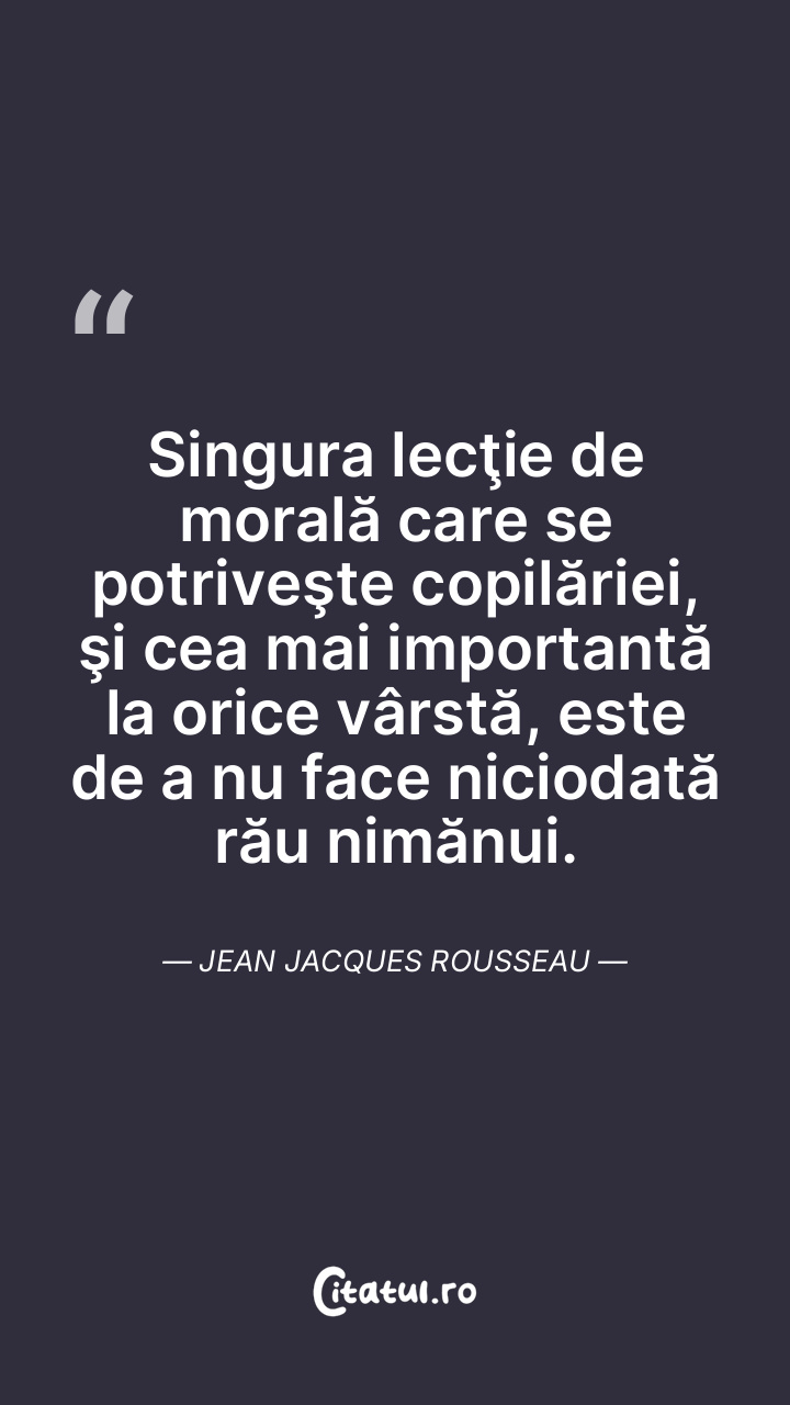 Singura lecţie de morală care se potriveşte copilăriei, şi cea mai importantă la orice vârstă, este de a nu face niciodată rău nimănui. Jean Jacques Rousseau