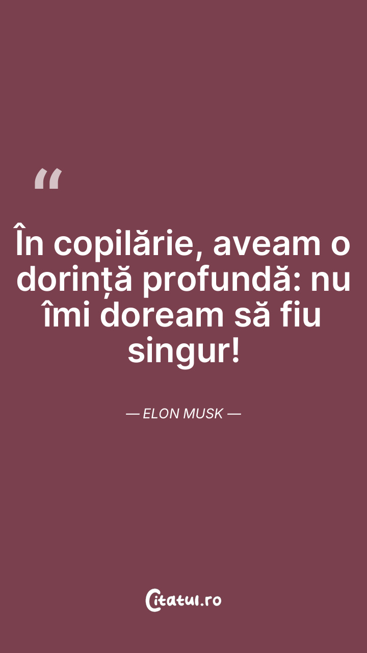 În copilărie, aveam o dorință profundă: nu îmi doream să fiu singur! Elon Musk