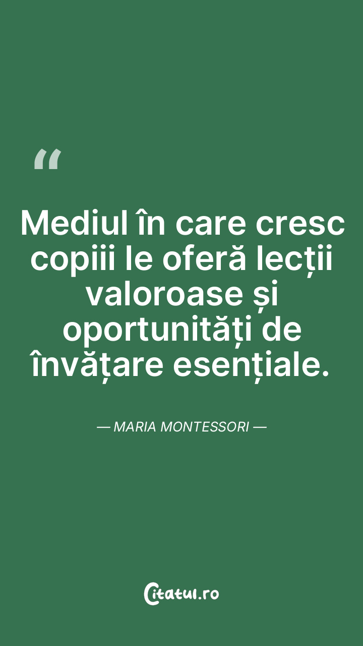 Mediul în care cresc copiii le oferă lecții valoroase și oportunități de învățare esențiale. Maria Montessori