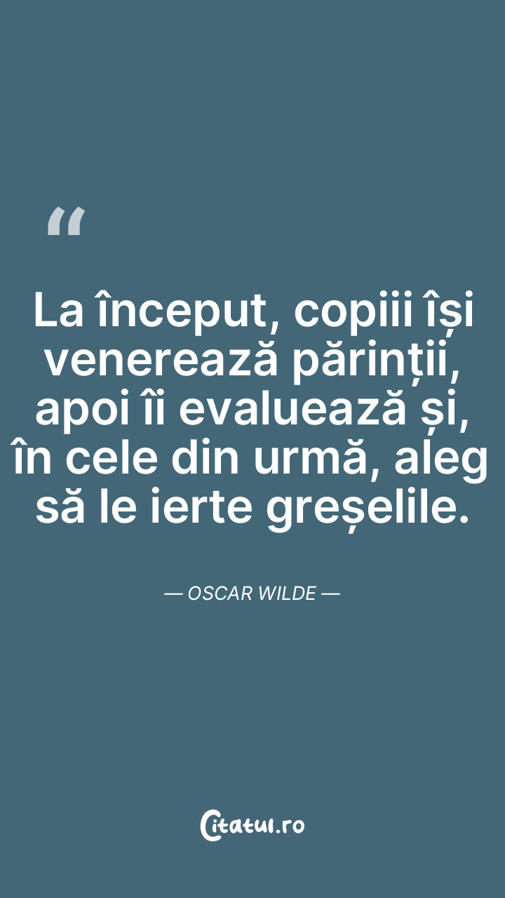 La început, copiii își venerează părinții, apoi îi evaluează și, în cele din urmă, aleg să le ierte greșelile. Oscar Wilde