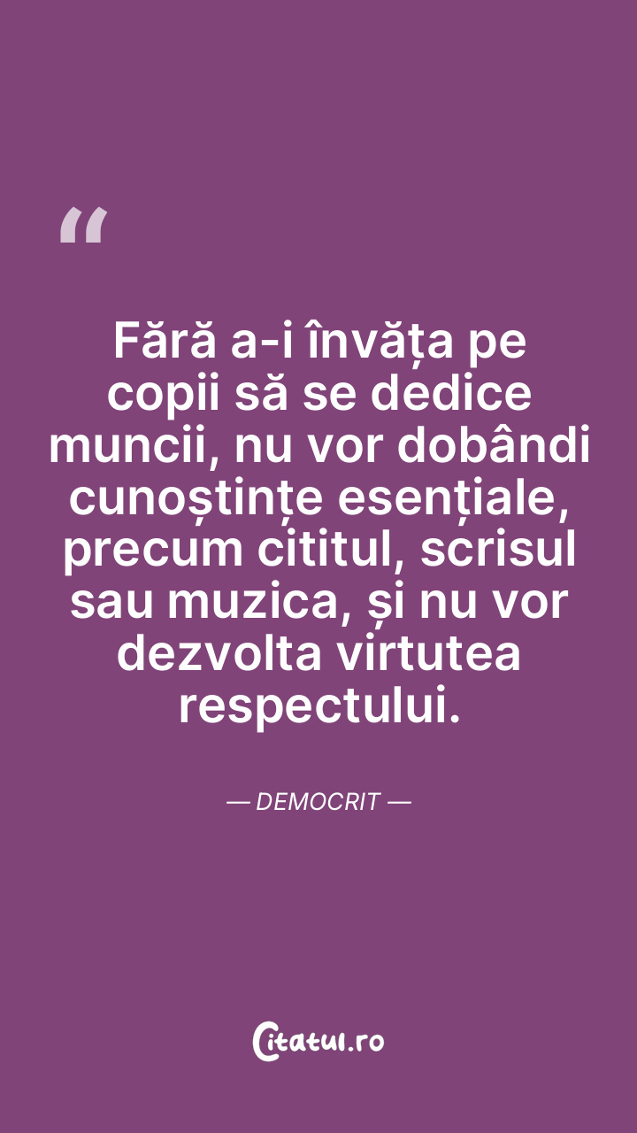 Fără a-i învăța pe copii să se dedice muncii, nu vor dobândi cunoștințe esențiale, precum cititul, scrisul sau muzica, și nu vor dezvolta virtutea respectului. Democrit