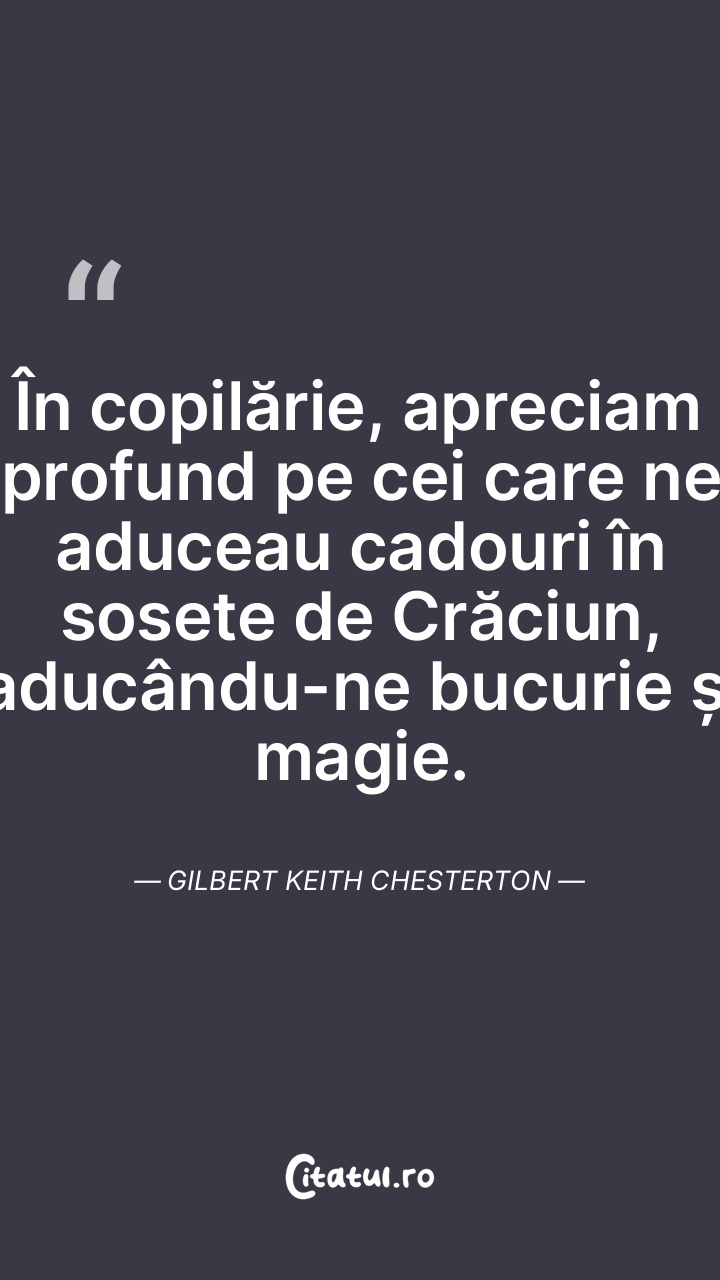 În copilărie, apreciam profund pe cei care ne aduceau cadouri în sosete de Crăciun, aducându-ne bucurie și magie. Gilbert Keith Chesterton