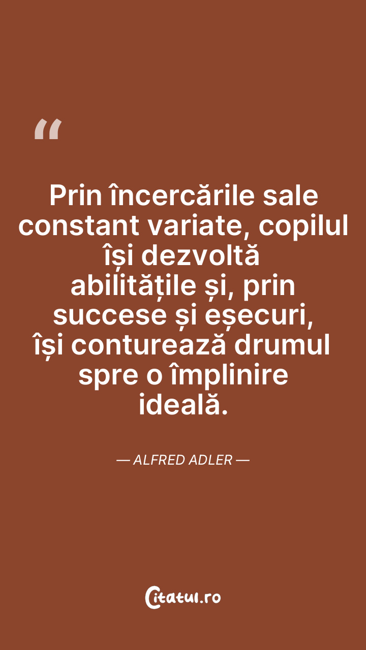 Prin încercările sale constant variate, copilul își dezvoltă abilitățile și, prin succese și eșecuri, își conturează drumul spre o împlinire ideală. Alfred Adler