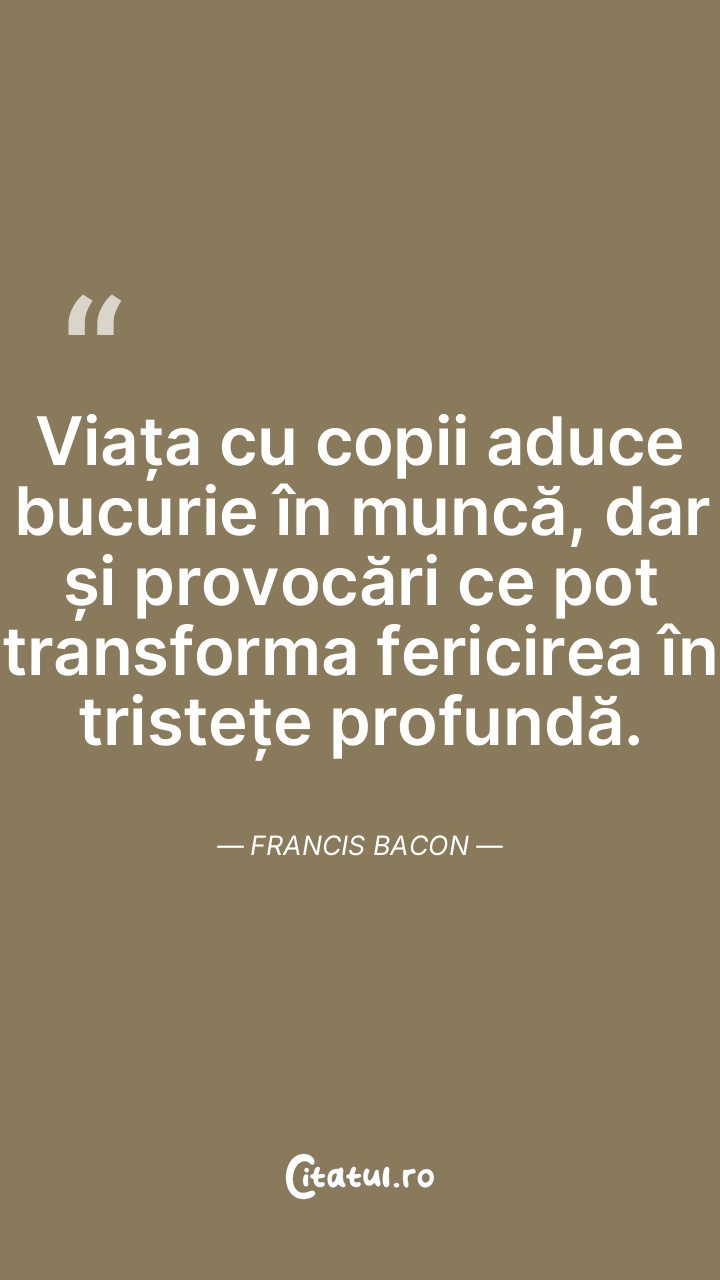 Viața cu copii aduce bucurie în muncă, dar și provocări ce pot transforma fericirea în tristețe profundă. Francis Bacon