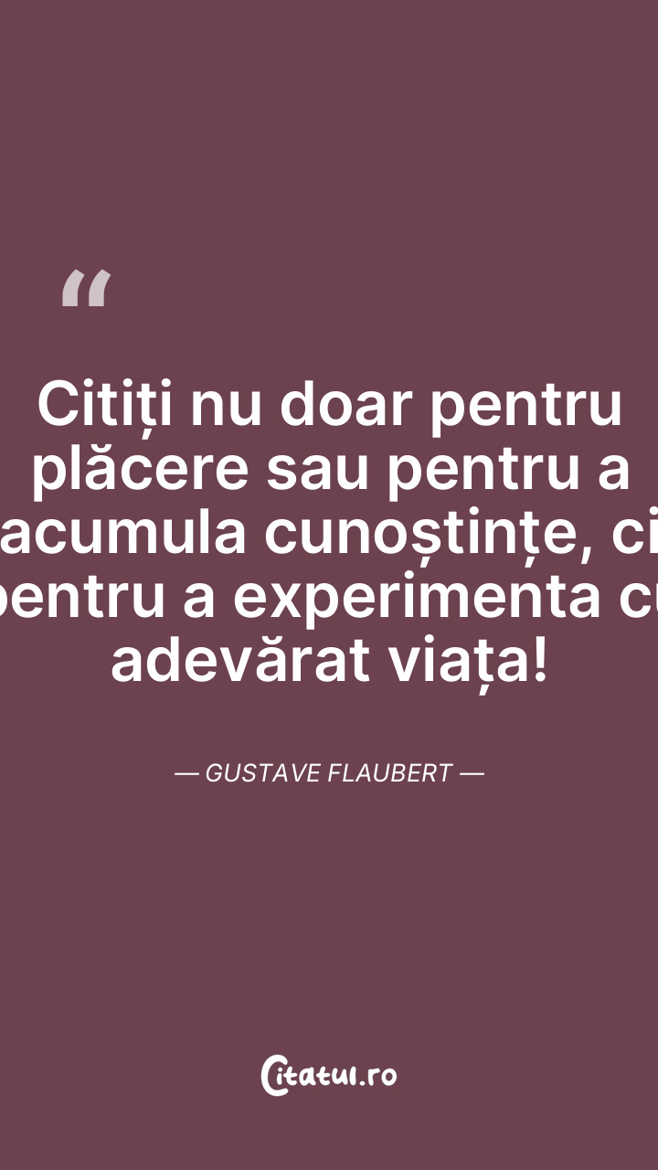 Citiți nu doar pentru plăcere sau pentru a acumula cunoștințe, ci pentru a experimenta cu adevărat viața! Gustave Flaubert