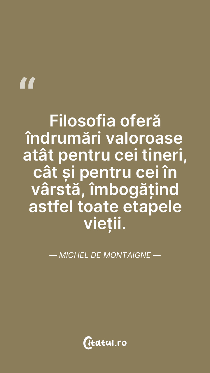 Filosofia oferă îndrumări valoroase atât pentru cei tineri, cât și pentru cei în vârstă, îmbogățind astfel toate etapele vieții. Michel de Montaigne