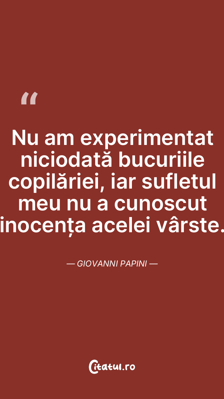 Nu am experimentat niciodată bucuriile copilăriei, iar sufletul meu nu a cunoscut inocența acelei vârste. Giovanni Papini