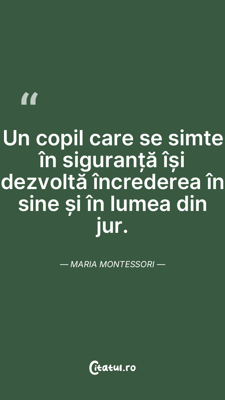 Un copil care se simte în siguranță își dezvoltă încrederea în sine și în lumea din jur. Maria Montessori