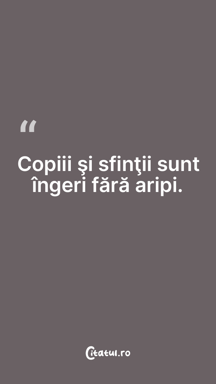 Copiii şi sfinţii sunt îngeri fără aripi. ... Categorie: citate copii Dificultate: Ușor de citit și înțeles Votează: ★ ★ ★ ★ ★ (0/5 din 0) Distribuiți acest citat? Alegeți platforma preferată: Salvează citatul in telefon/pc Copiii şi sfinţii sunt îngeri fără aripi. Copiază Favorite Eroare