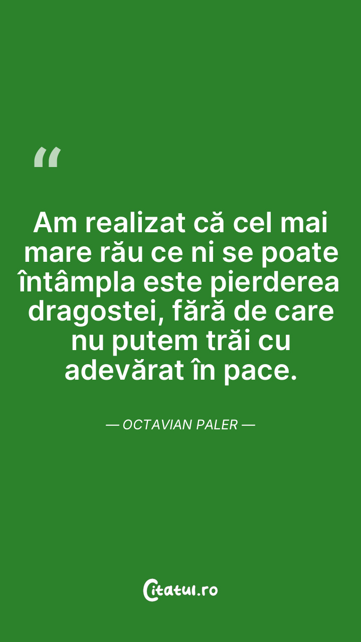 Am realizat că cel mai mare rău ce ni se poate întâmpla este pierderea dragostei, fără de care nu putem trăi cu adevărat în pace. Octavian Paler