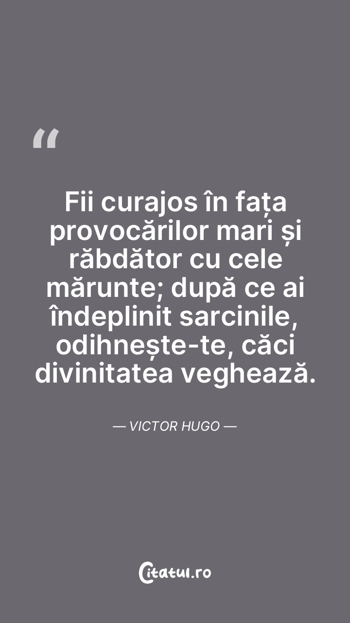 Fii curajos în fața provocărilor mari și răbdător cu cele mărunte; după ce ai îndeplinit sarcinile, odihnește-te, căci divinitatea veghează. Victor Hugo