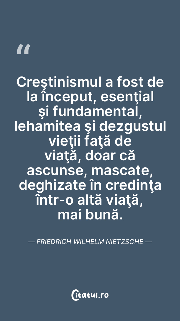 Creştinismul a fost de la început, esenţial şi fundamental, lehamitea şi dezgustul vieţii faţă de viaţă, doar că ascunse, mascate, deghizate în credinţa într-o altă viaţă, mai bună. Friedrich Wilhelm Nietzsche