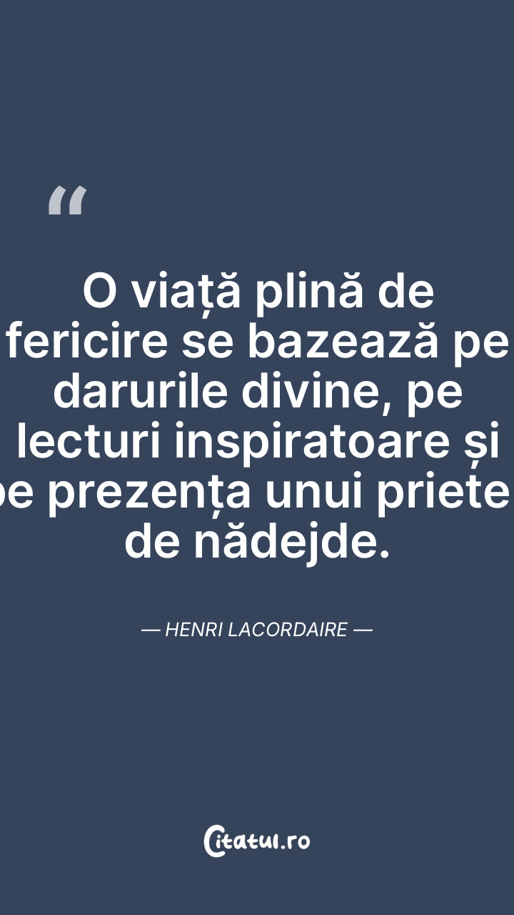 O viață plină de fericire se bazează pe darurile divine, pe lecturi inspiratoare și pe prezența unui prieten de nădejde. Henri Lacordaire