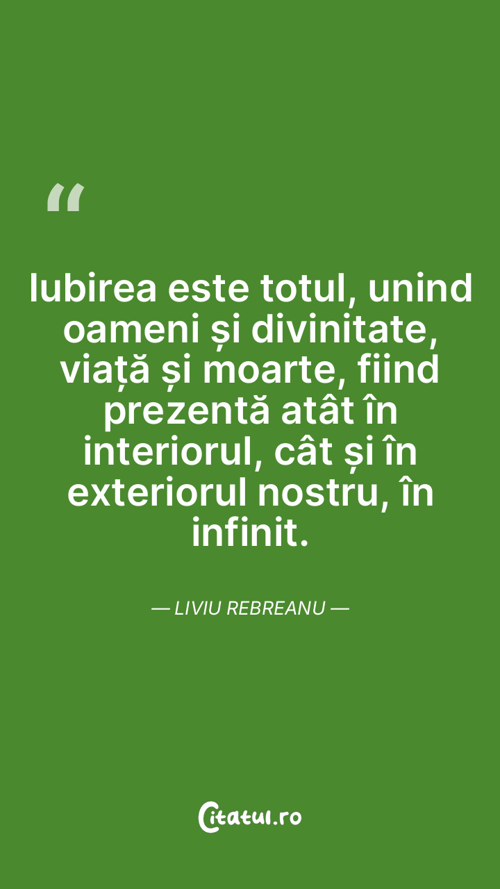 Iubirea este totul, unind oameni și divinitate, viață și moarte, fiind prezentă atât în interiorul, cât și în exteriorul nostru, în infinit. Liviu Rebreanu