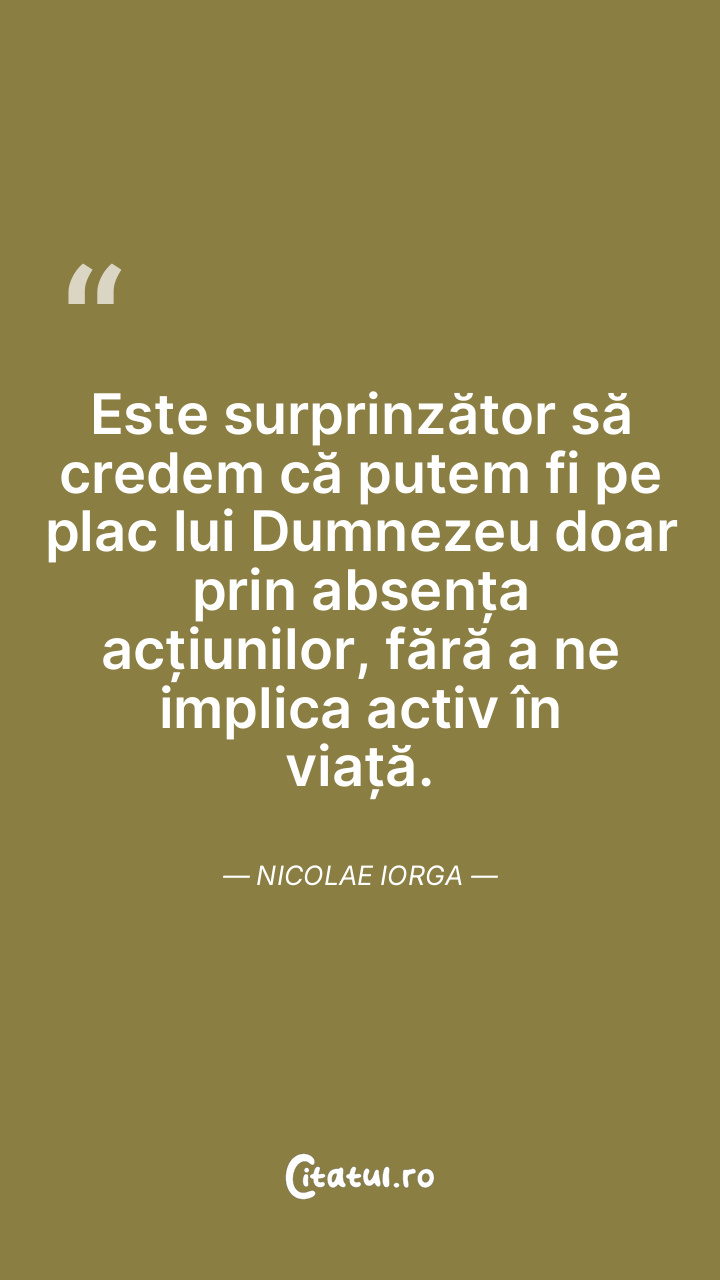 Este surprinzător să credem că putem fi pe plac lui Dumnezeu doar prin absența acțiunilor, fără a ne implica activ în viață. Nicolae Iorga