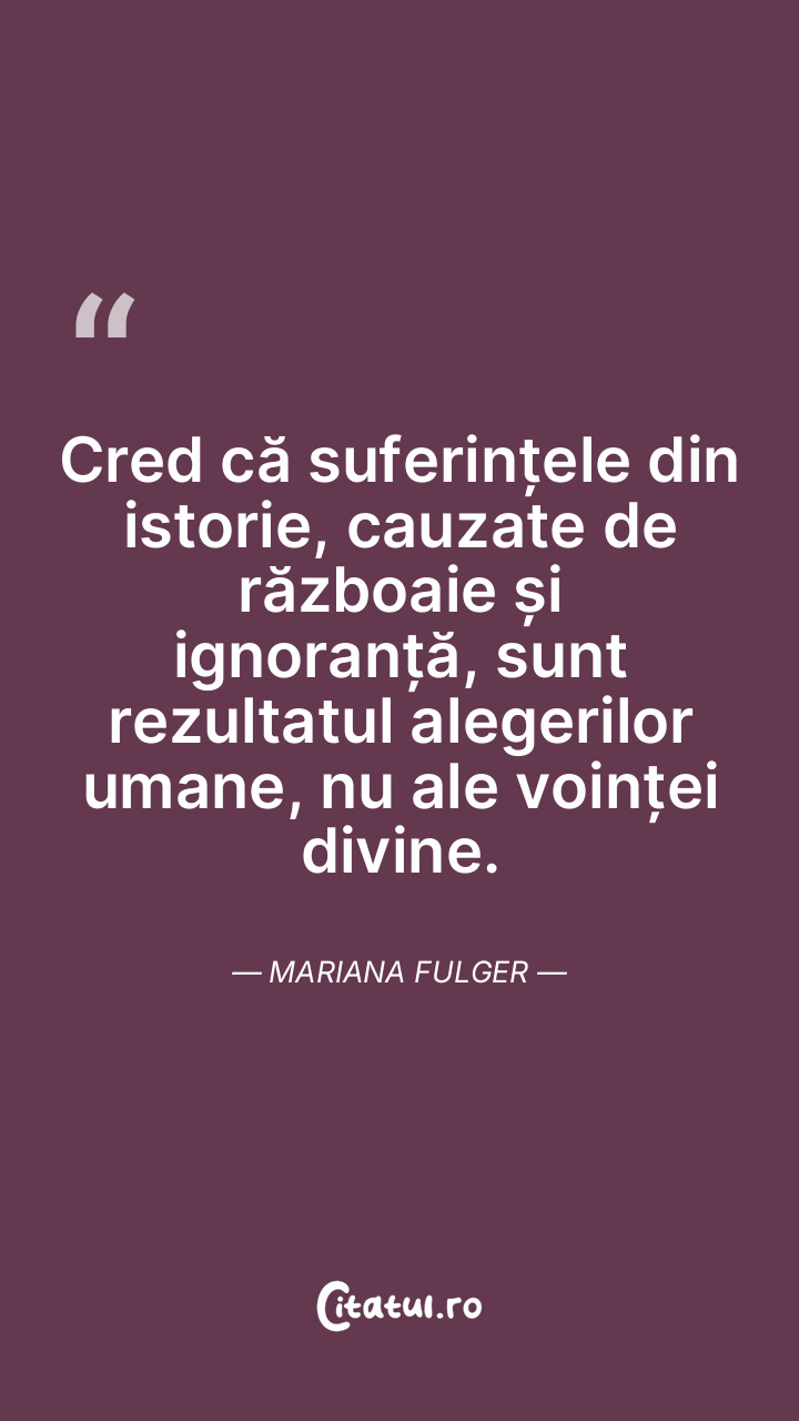 Cred că suferințele din istorie, cauzate de războaie și ignoranță, sunt rezultatul alegerilor umane, nu ale voinței divine. Mariana Fulger