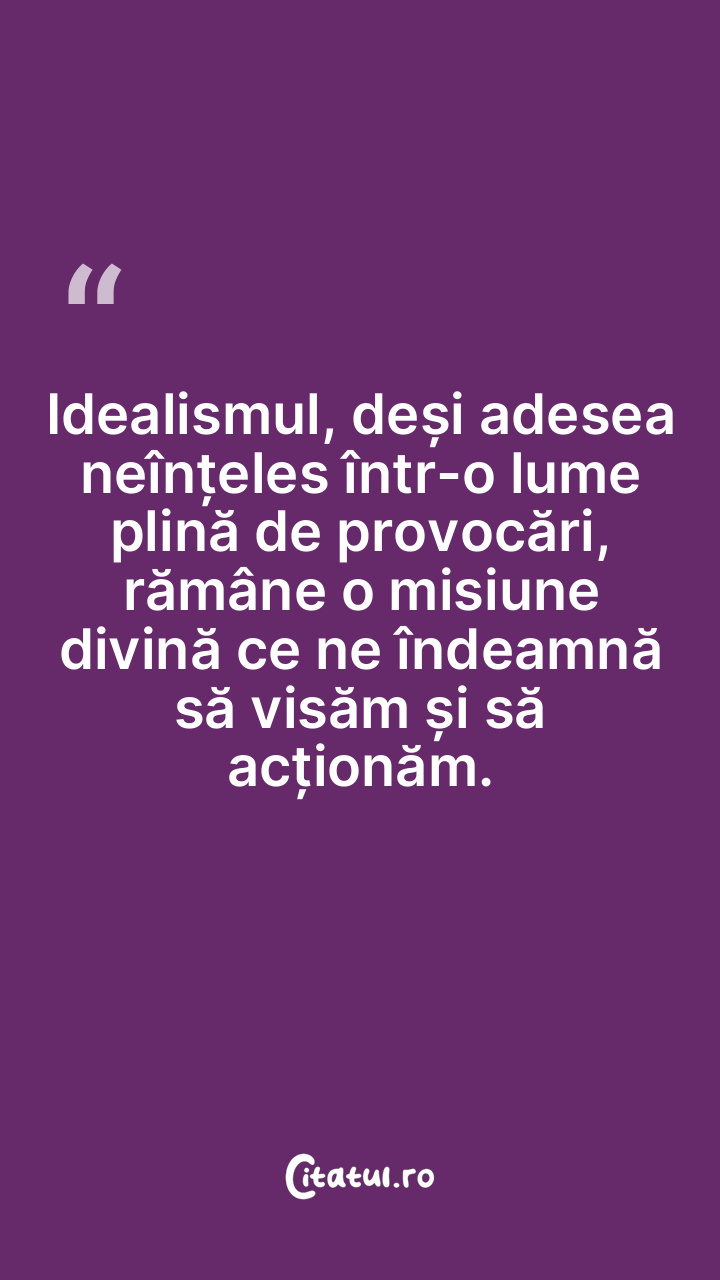 Idealismul, deși adesea neînțeles într-o lume plină de provocări, rămâne o misiune divină ce ne îndeamnă să visăm și să acționăm.