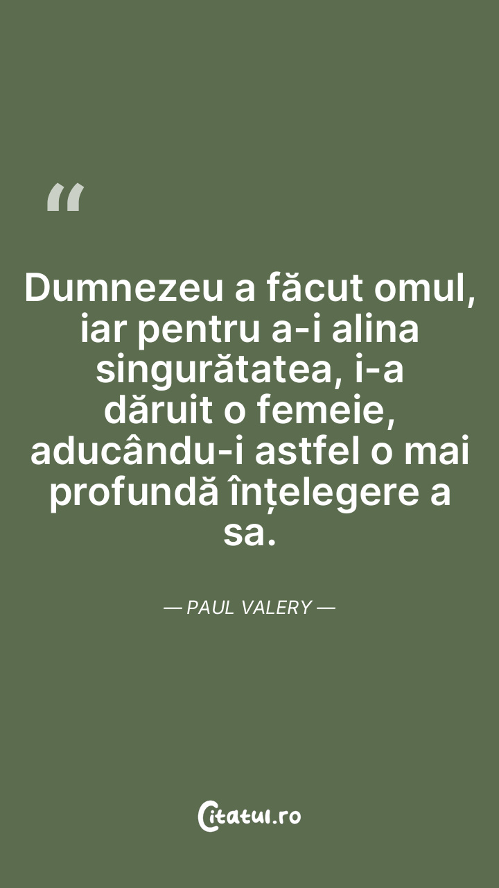 Dumnezeu a făcut omul, iar pentru a-i alina singurătatea, i-a dăruit o femeie, aducându-i astfel o mai profundă înțelegere a sa. Paul Valery