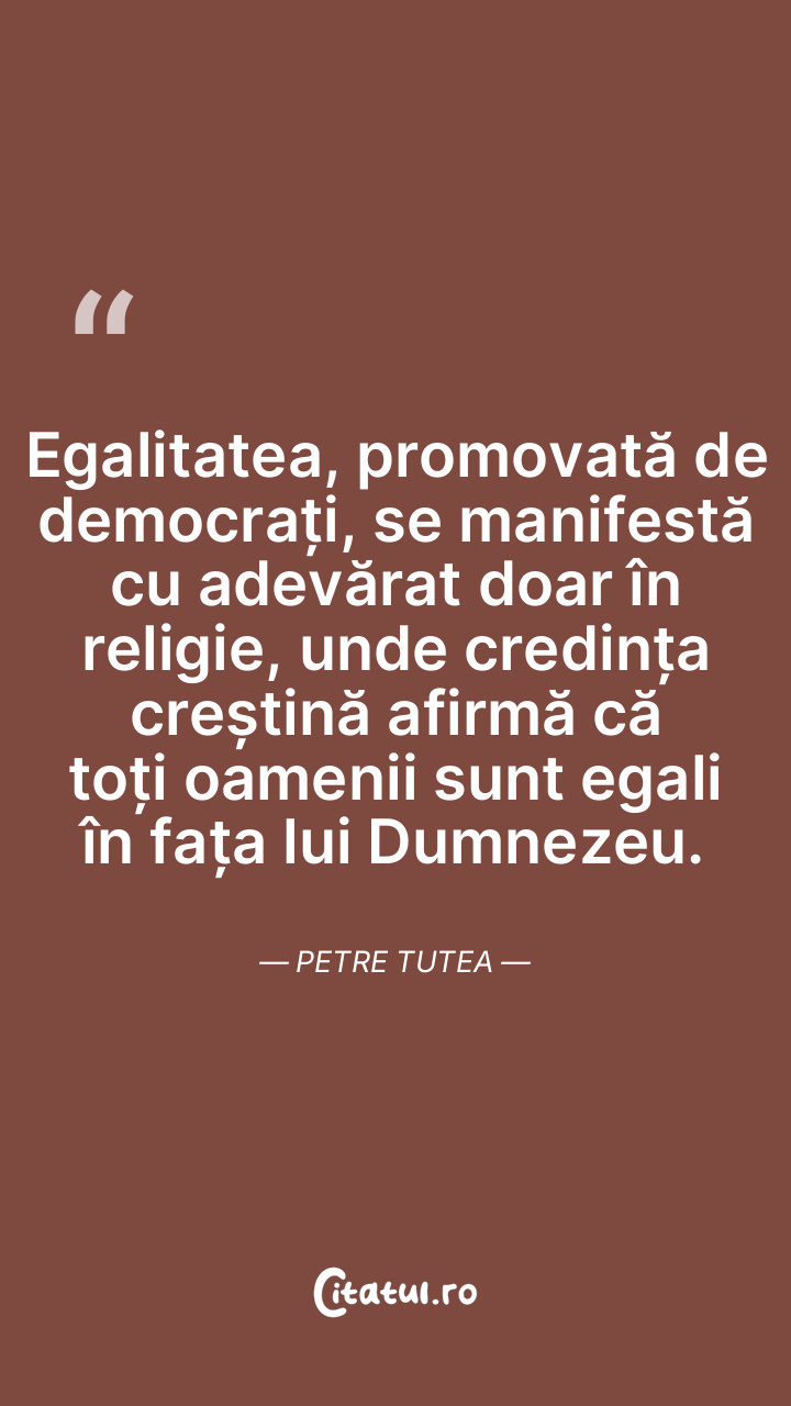 Egalitatea, promovată de democrați, se manifestă cu adevărat doar în religie, unde credința creștină afirmă că toți oamenii sunt egali în fața lui Dumnezeu. Petre Tutea