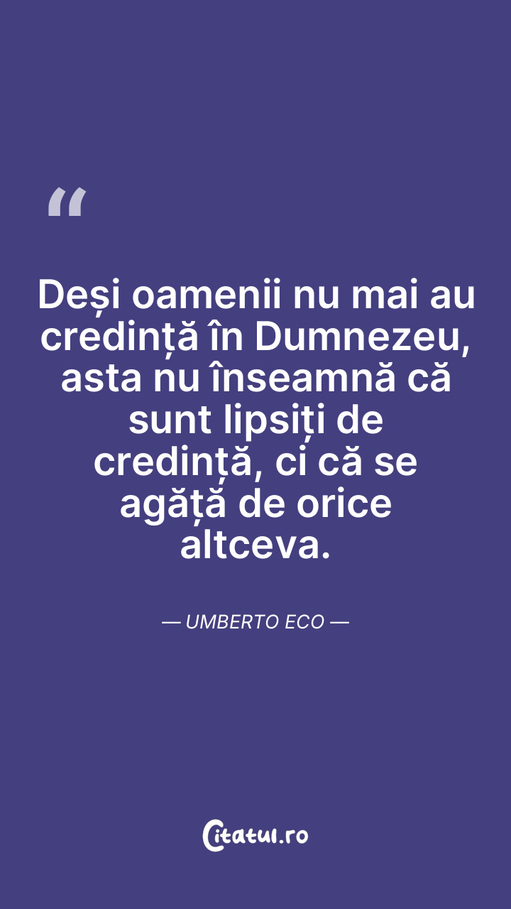 Deși oamenii nu mai au credință în Dumnezeu, asta nu înseamnă că sunt lipsiți de credință, ci că se agăță de orice altceva. Umberto Eco