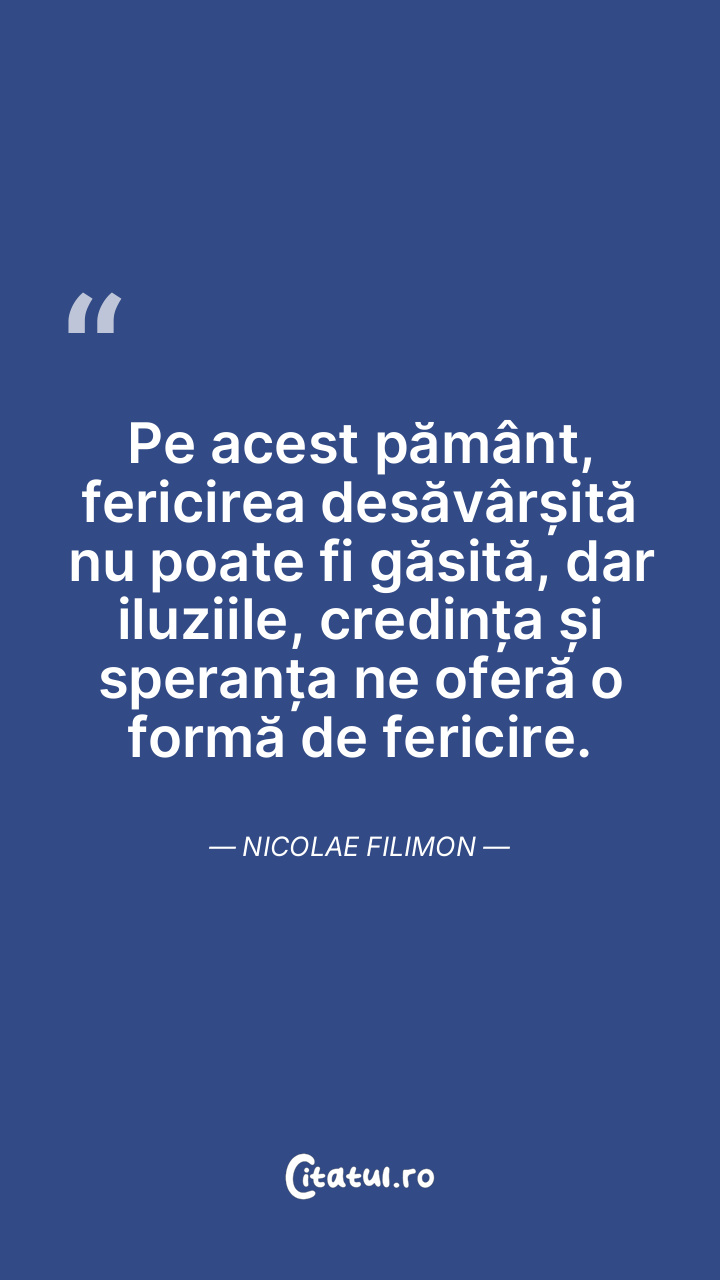 Pe acest pământ, fericirea desăvârșită nu poate fi găsită, dar iluziile, credința și speranța ne oferă o formă de fericire. Nicolae Filimon