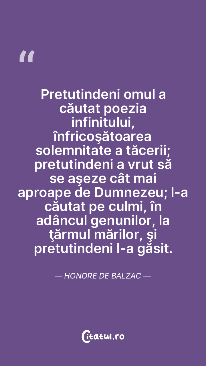 Pretutindeni omul a căutat poezia infinitului, înfricoşătoarea solemnitate a tăcerii; pretutindeni a vrut să se aşeze cât mai aproape de Dumnezeu; l-a căutat pe culmi, în adâncul genunilor, la ţărmul mărilor, şi pretutindeni l-a găsit. Honore de Balzac