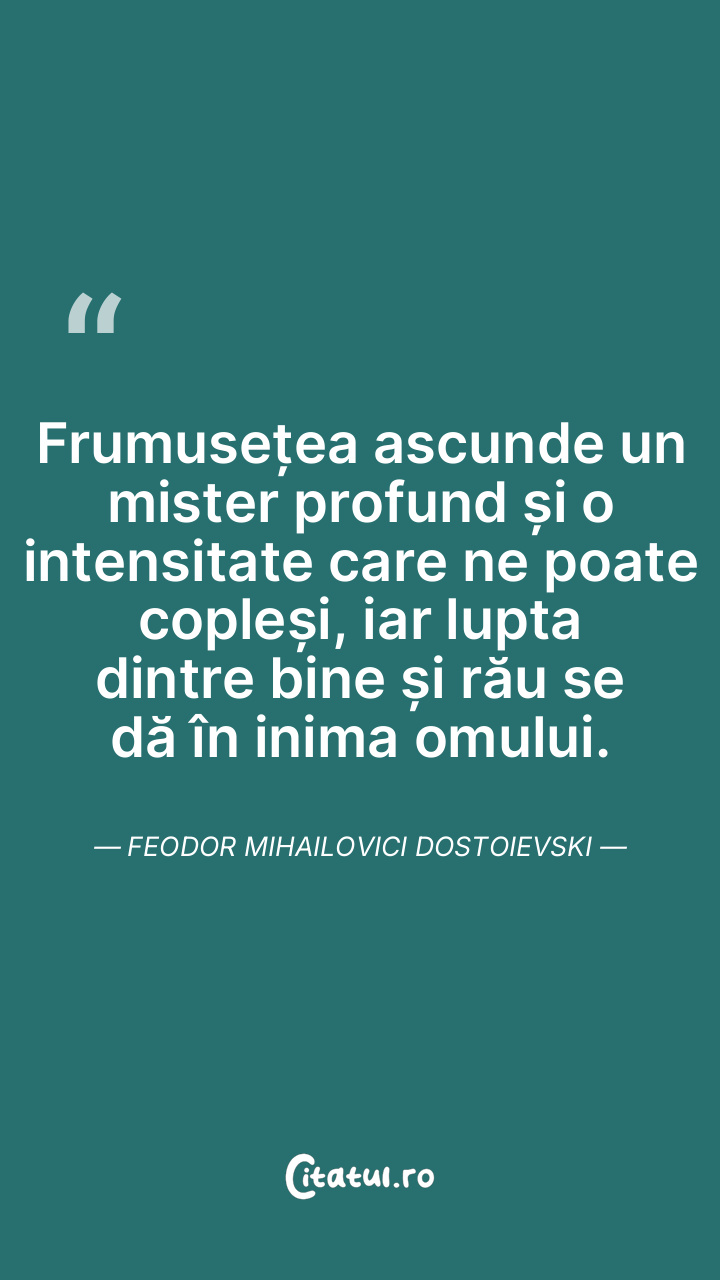 Frumusețea ascunde un mister profund și o intensitate care ne poate copleși, iar lupta dintre bine și rău se dă în inima omului. Feodor Mihailovici Dostoievski