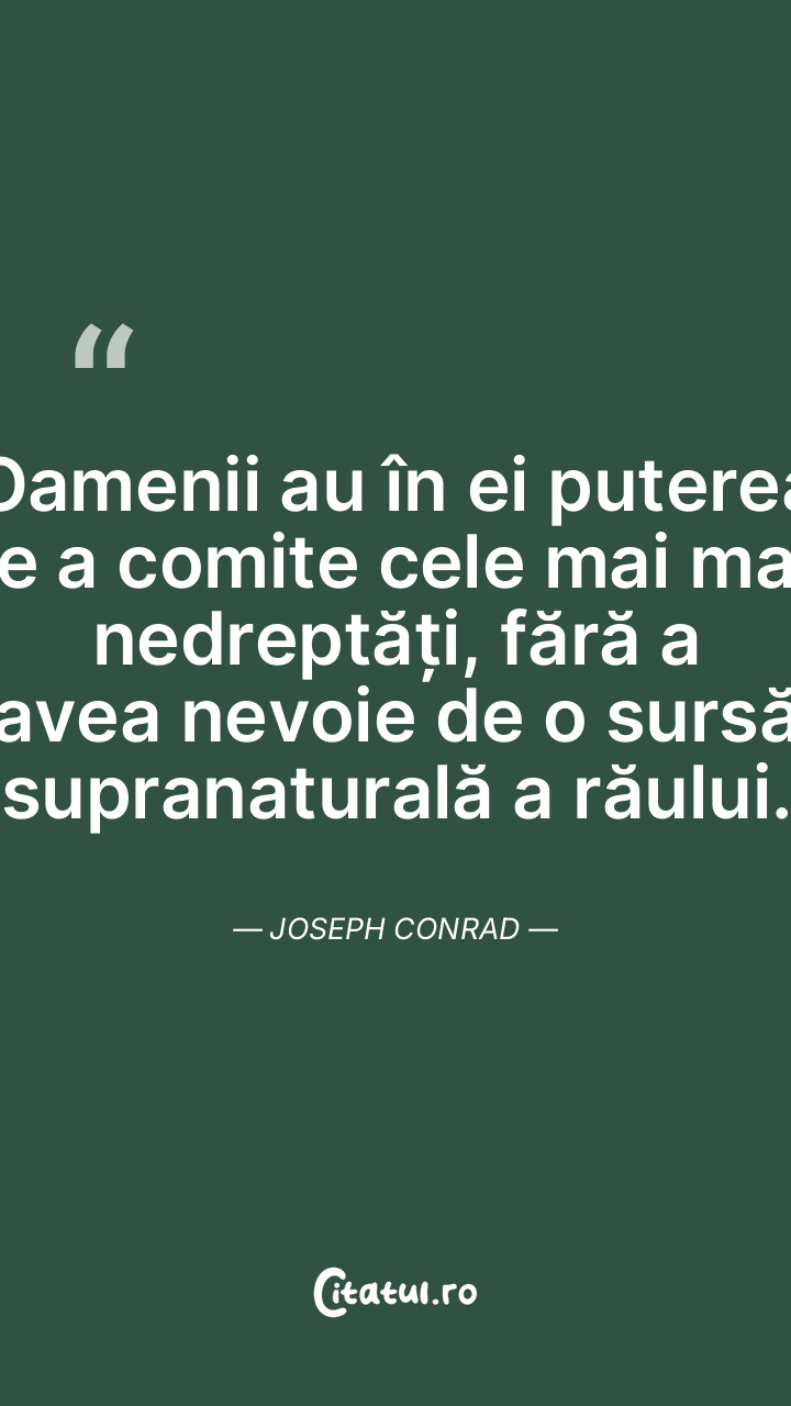 Oamenii au în ei puterea de a comite cele mai mari nedreptăți, fără a avea nevoie de o sursă supranaturală a răului. Joseph Conrad