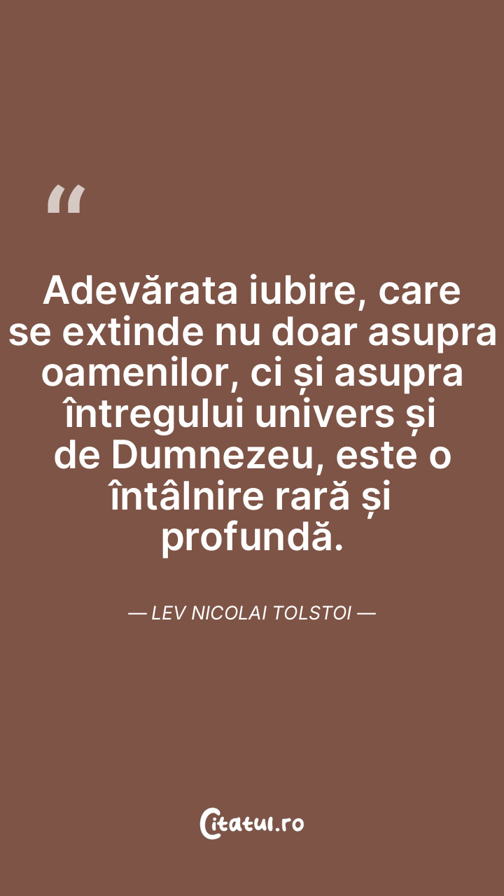 Adevărata iubire, care se extinde nu doar asupra oamenilor, ci și asupra întregului univers și de Dumnezeu, este o întâlnire rară și profundă. Lev Nicolai Tolstoi
