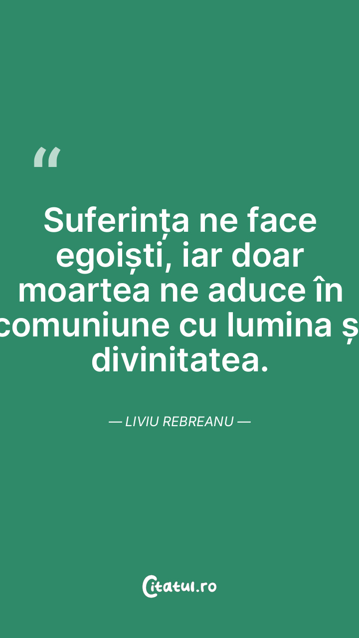 Suferința ne face egoiști, iar doar moartea ne aduce în comuniune cu lumina și divinitatea. Liviu Rebreanu