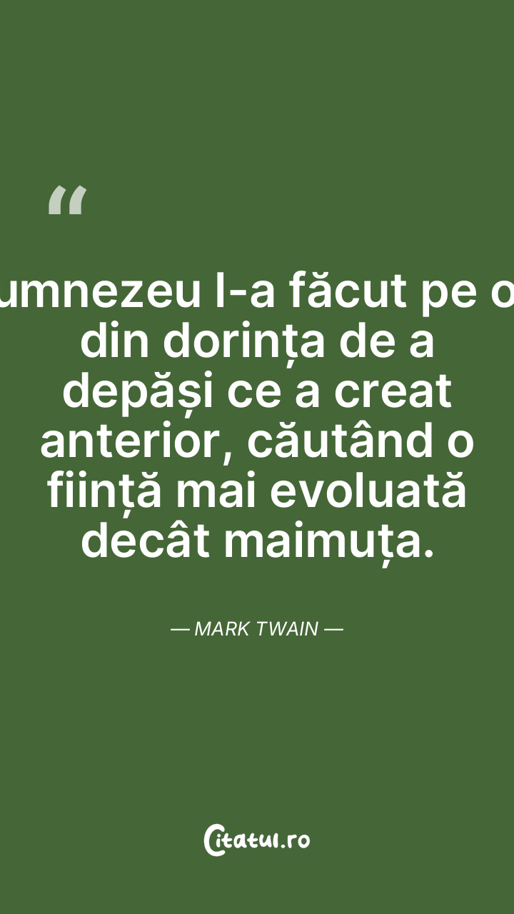 Dumnezeu l-a făcut pe om din dorința de a depăși ce a creat anterior, căutând o ființă mai evoluată decât maimuța. Mark Twain