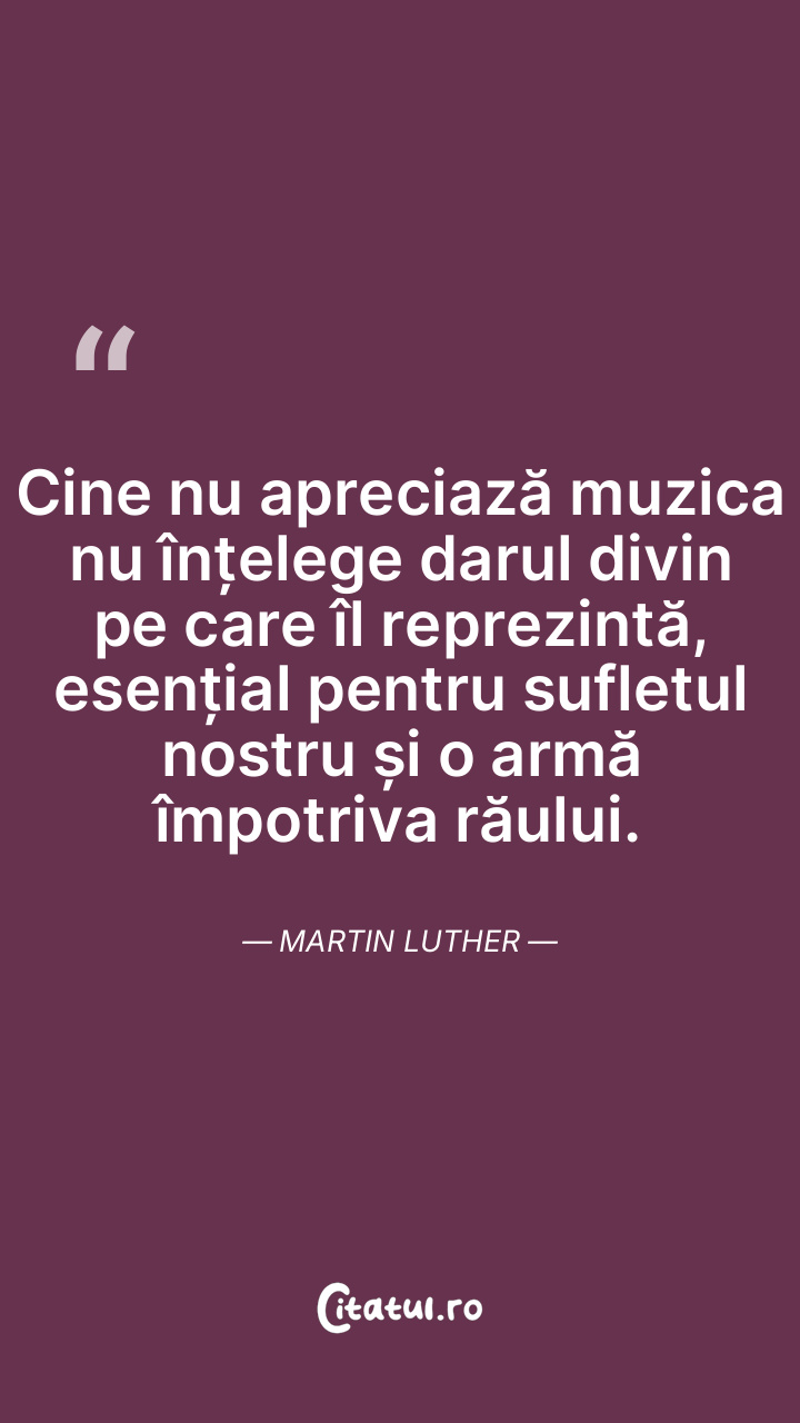 Cine nu apreciază muzica nu înțelege darul divin pe care îl reprezintă, esențial pentru sufletul nostru și o armă împotriva răului. Martin Luther