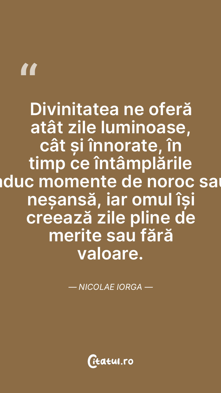 Divinitatea ne oferă atât zile luminoase, cât și înnorate, în timp ce întâmplările aduc momente de noroc sau neșansă, iar omul își creează zile pline de merite sau fără valoare. Nicolae Iorga