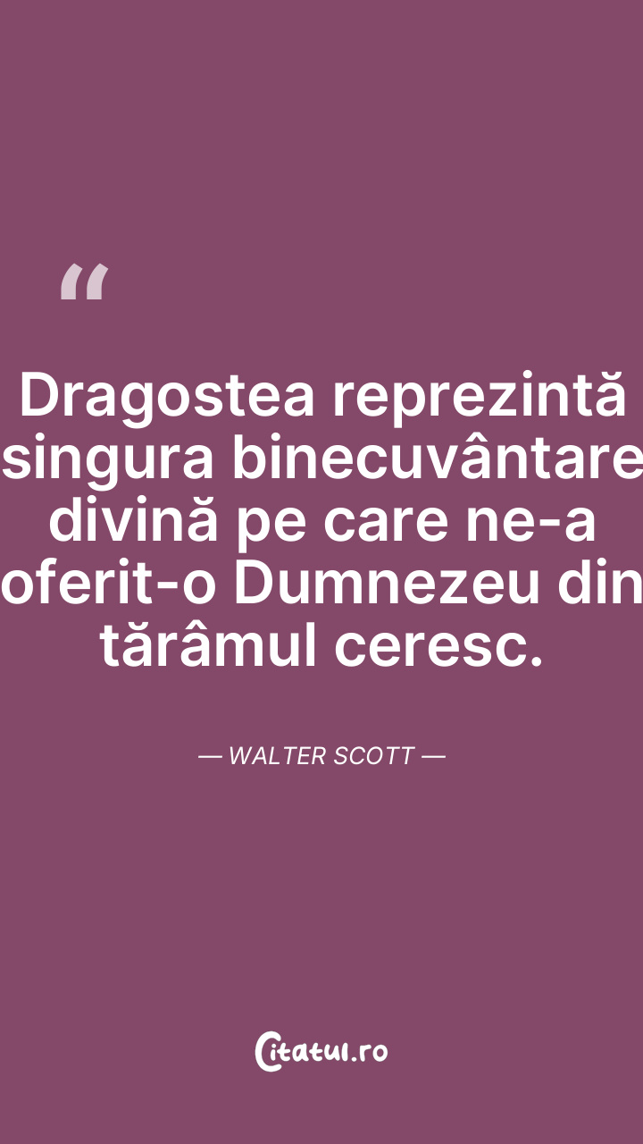 Dragostea reprezintă singura binecuvântare divină pe care ne-a oferit-o Dumnezeu din tărâmul ceresc. Walter Scott