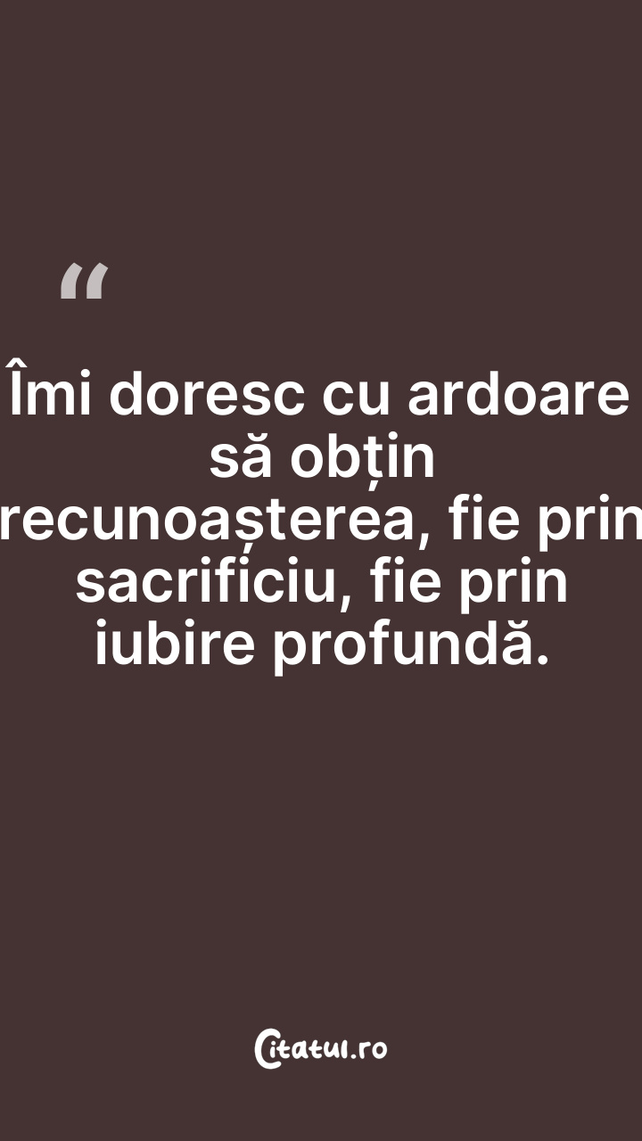 Îmi doresc cu ardoare să obțin recunoașterea, fie prin sacrificiu, fie prin iubire profundă.