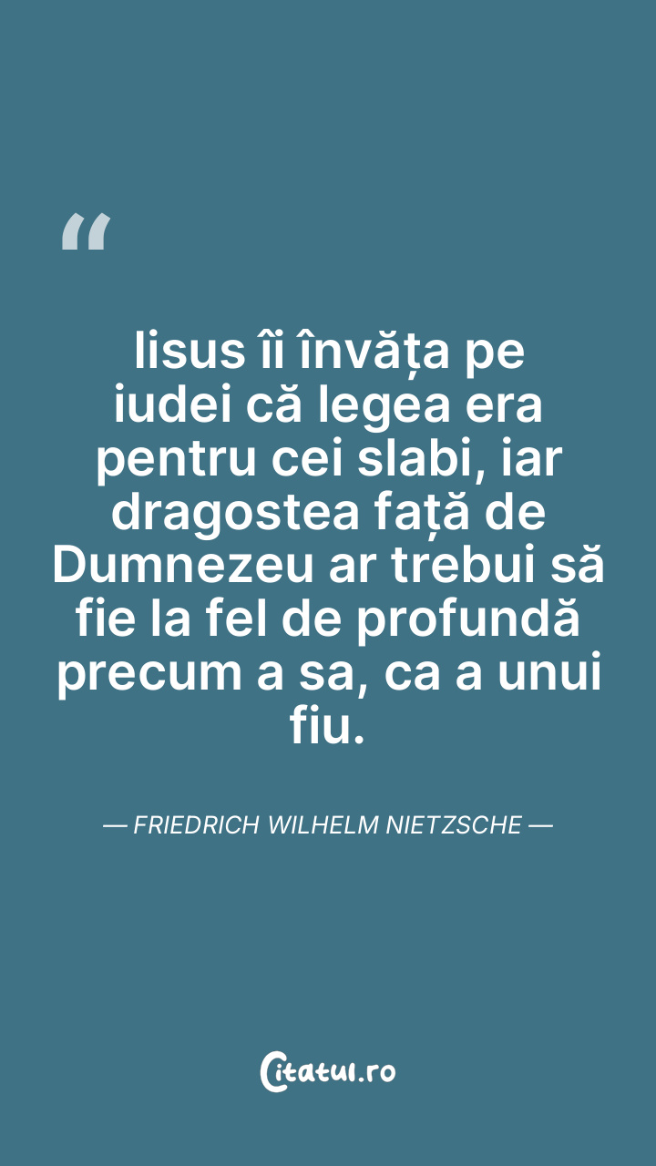 Iisus îi învăța pe iudei că legea era pentru cei slabi, iar dragostea față de Dumnezeu ar trebui să fie la fel de profundă precum a sa, ca a unui fiu. Friedrich Wilhelm Nietzsche