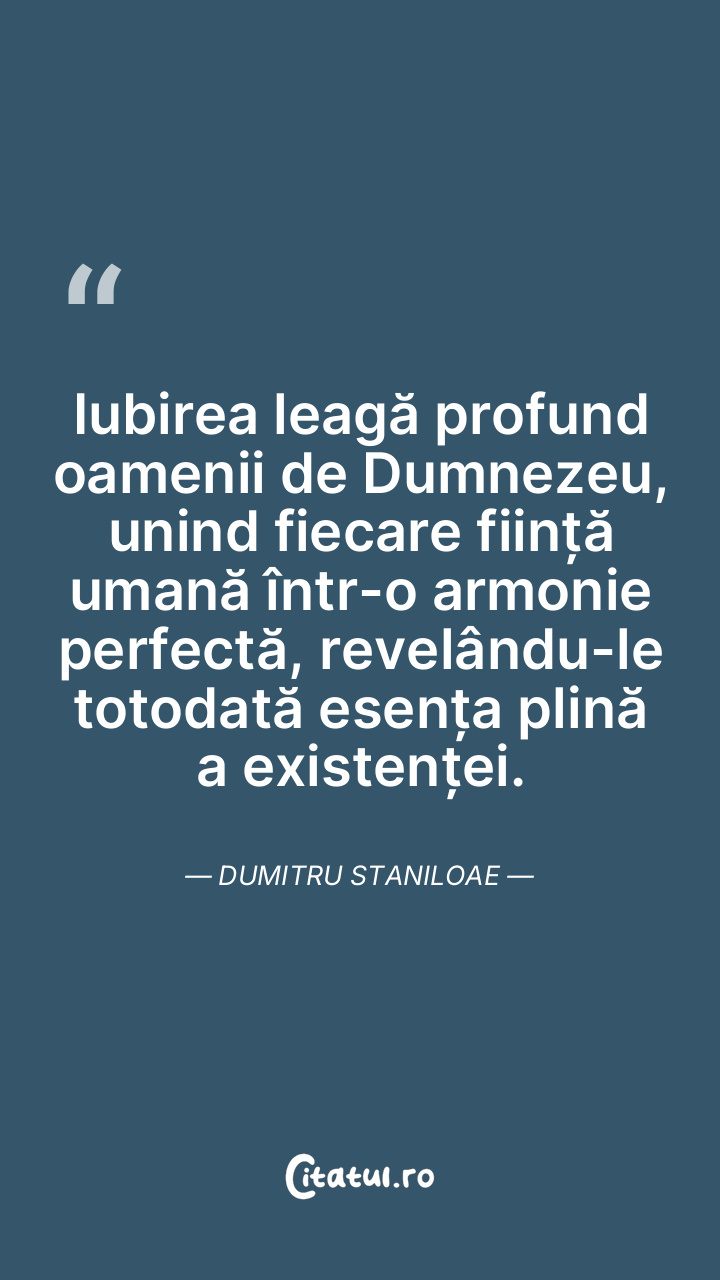 Iubirea leagă profund oamenii de Dumnezeu, unind fiecare ființă umană într-o armonie perfectă, revelându-le totodată esența plină a existenței. Dumitru Staniloae