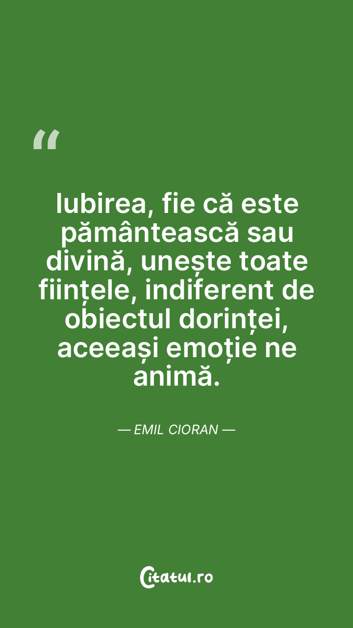 Iubirea, fie că este pământească sau divină, unește toate ființele, indiferent de obiectul dorinței, aceeași emoție ne animă. Emil Cioran