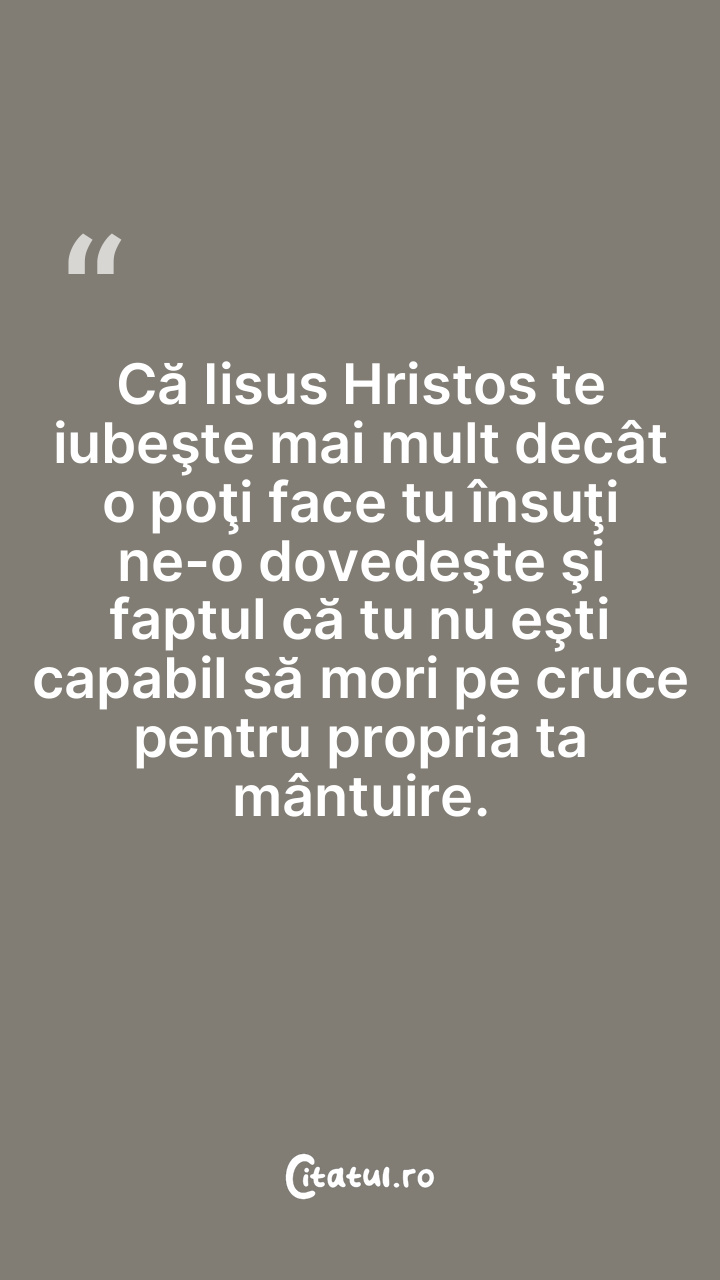 Că Iisus Hristos te iubeşte mai mult decât o poţi face tu însuţi ne-o dovedeşte şi faptul că tu nu eşti capabil să mori pe cruce pentru propria ta mântuire.