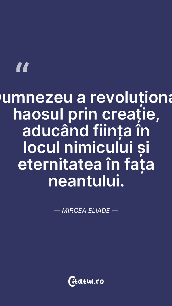 Dumnezeu a revoluționat haosul prin creație, aducând ființa în locul nimicului și eternitatea în fața neantului. Mircea Eliade